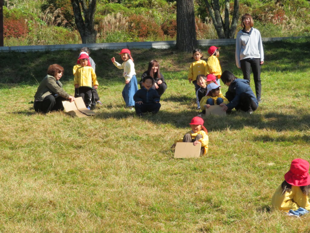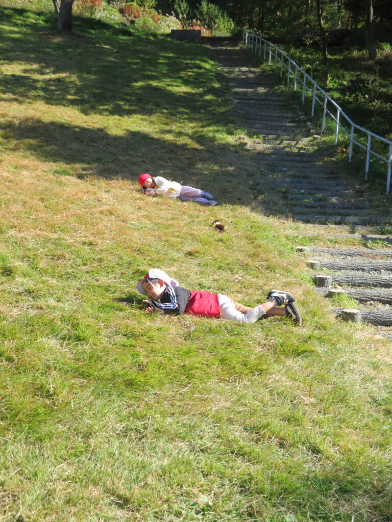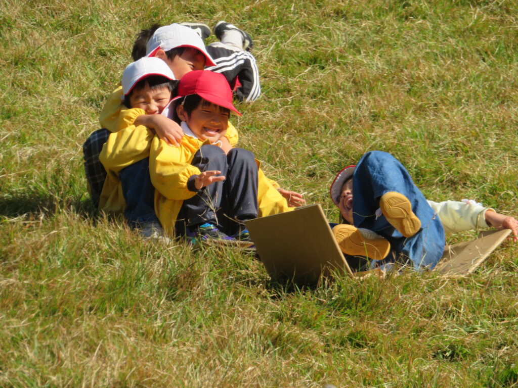 そして、この遠足の(思いもよらなかった)一番のイベントとなった「草滑り」!!坂をゴロゴロと転がり出した子たちをきっかけに、おやつを入れてきた段ボールが良いソリとなり、思いっきりあそぶ子どもたちでした😃