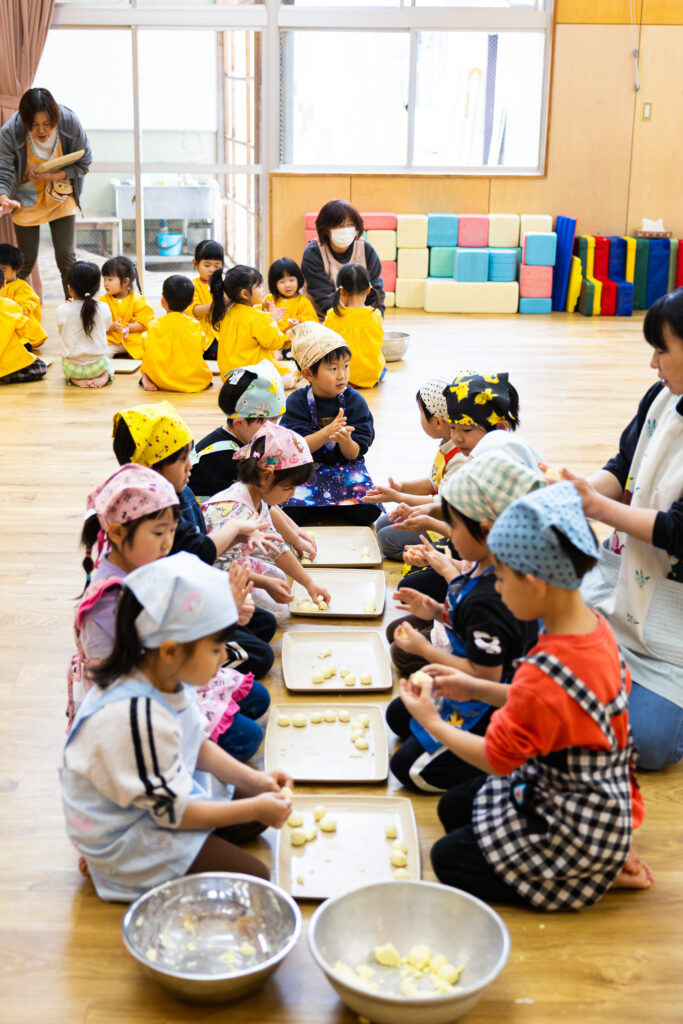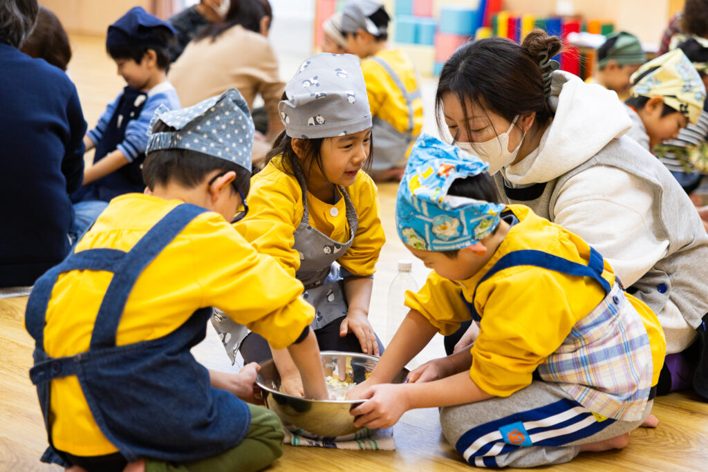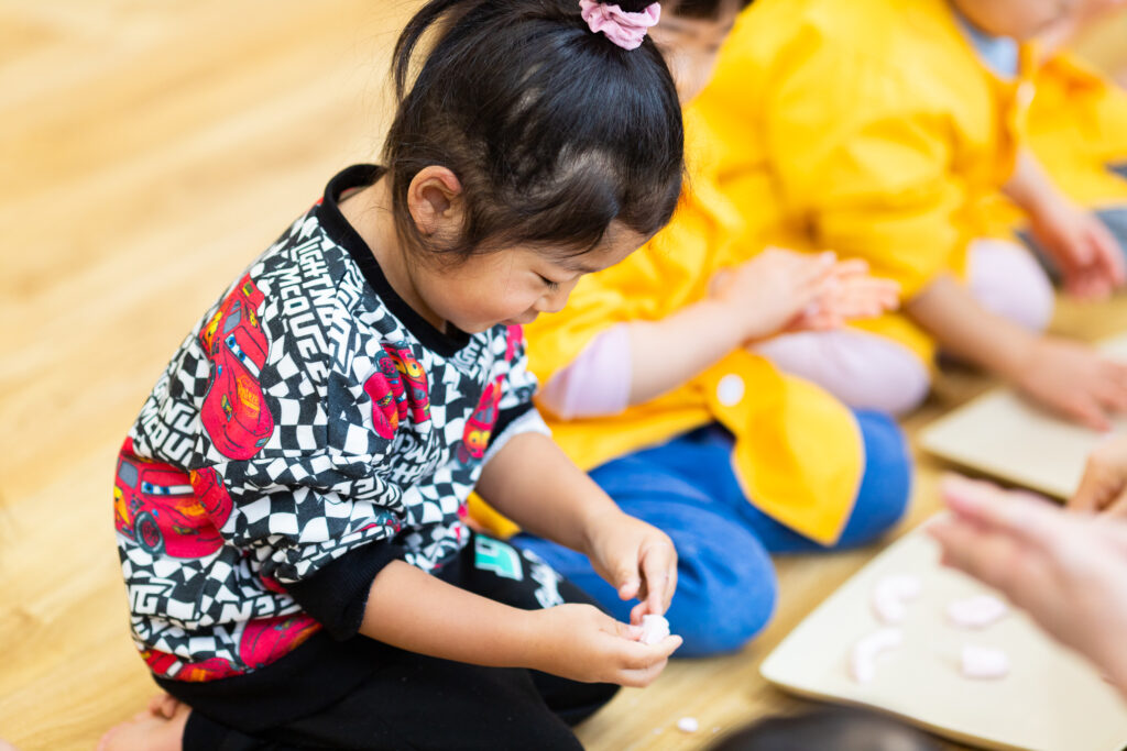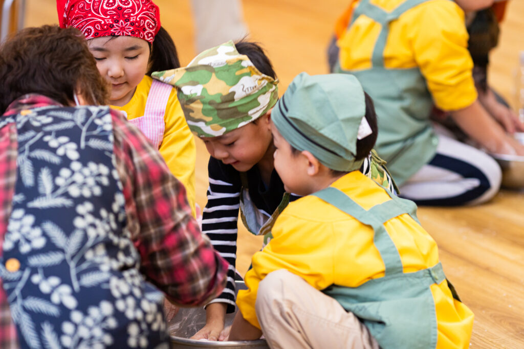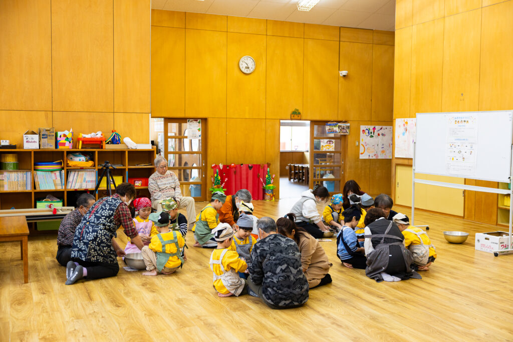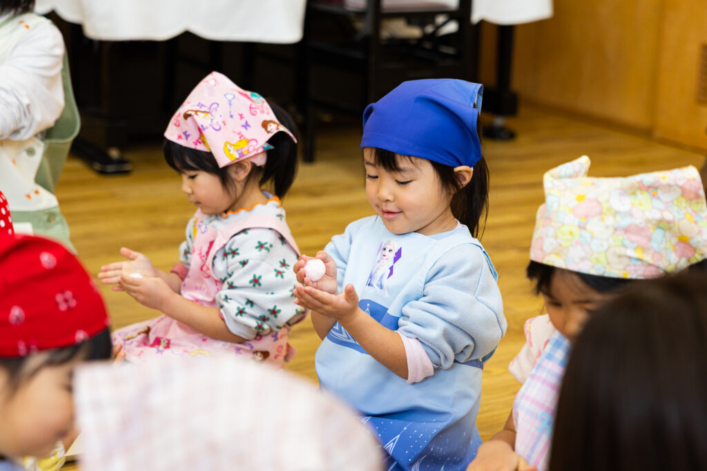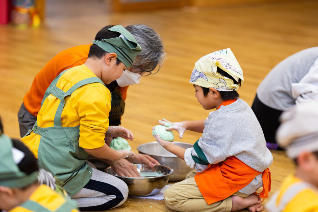 おじいちゃん、おばあちゃんに教わりながら、嬉しそうに粉をこねる松組さんの姿がとても微笑ましかったです😊交流を通して伝統行事を身近に感じることができました。他のクラスのみんなもお団子の感触を楽しみながらたくさん作っていました!